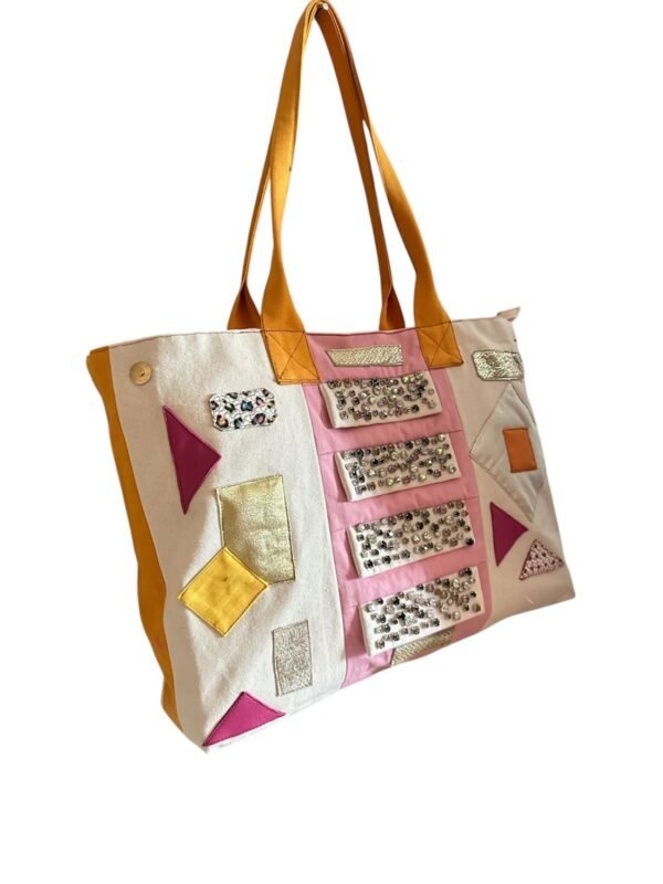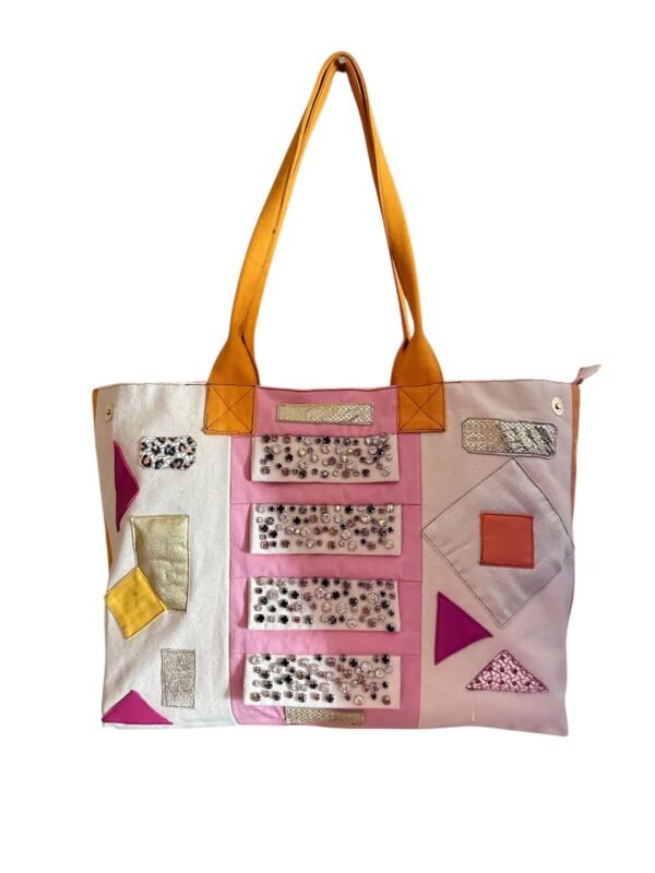 Üzerindeki geometrik şekiller ve taş işlemelerle her biri farklı doku ve renk sunarak çantaya sanatsal bir dokunuş katıyor. Sarı sap detayı sayesinde elde taşımaya uygundur.