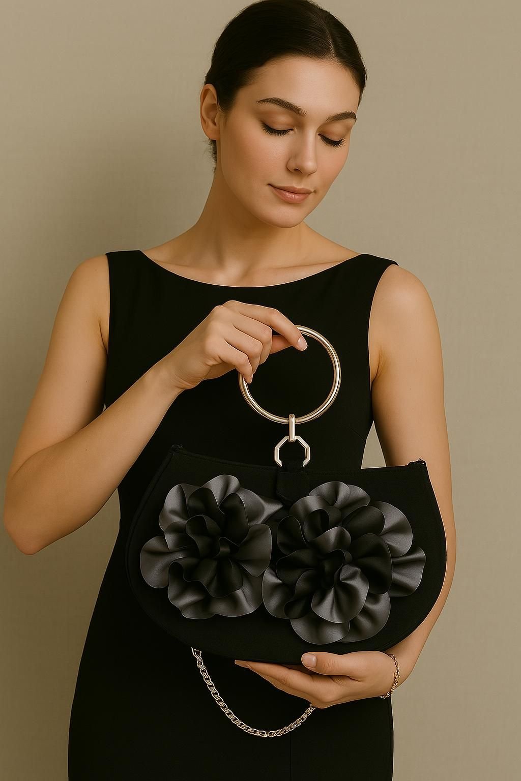 Siyah peluş yüzeye sahip, yumuşak dokulu ve modern tasarım omuz çantasıdır.