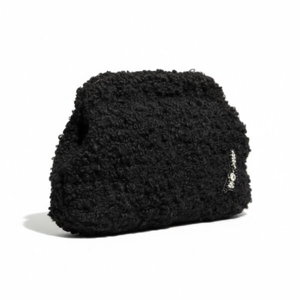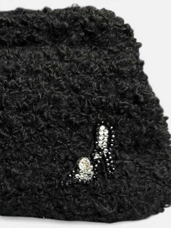 Gece zarafetinden ilham alan özel bir tasarım.; Tamamen el örgüsü dokusuyla hazırlanan bu siyah clutch çanta, ön yüzündeki zarif taş işlemeli topuklu ayakkabı motifi ile feminen ve sofistike bir karakter taşır.;